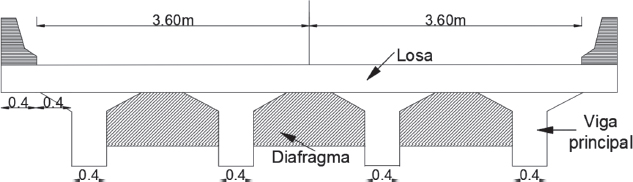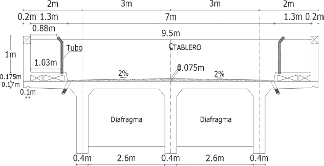 Se considera un puente tipo viga – losa de hormigón armado, cuyos elementos estructurales presentan un hormigón con una resistencia de f’c = 21 MPa y un acero de refuerzo con una resistencia de fy = 420 MPa. El puente consta de una dimensión de 30 m de longitud y 10 m de ancho, constituido por una calzada de dos carriles los cuales presentan un ancho de 3.5 m y dos pasos peatonales o aceras de 1.5 m cada uno incluyendo las barandas, con lo cual se conforma un ancho total del puente de 10 metros. La losa del puente presenta un espesor constante de 21 cm entre las vigas y variable hasta 17 cm al finalizar el volado. Esta losa se encuentra soportada por 3 vigas longitudinales acarteladas con una altura de 2 m y ancho de 40 cm cada una. Entre las vigas se tienen dos diafragmas exteriores con una dimensión de 25 x 145 cm y dos diafragmas intermedios con una dimensión de 20 x 129 cm. La losa, además, presenta una barrera de protección conformada por una acera y una baranda peatonal.
