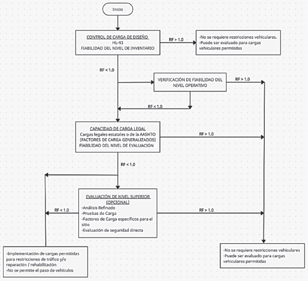 La metodología LRFR está basada en un conjunto de procedimiento o pasos a seguir que permiten llegar a un sistema de evaluación eficiente. Principalmente consta de tres aspectos secuenciales que posteriormente se subdividirán o permitirán continuar con el proceso de evaluación. Para una mejor comprensión de la metodología LRFR se presenta un diagrama de flujo en la Figura 5, en el cual se representa las etapas necesarias para la aplicación de este método.
