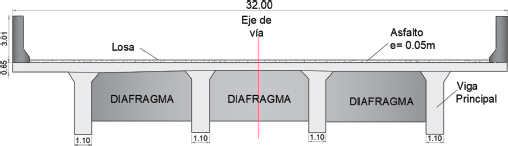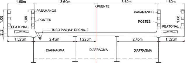 Para entender mejor el diseño de la superestructura del puente, se muestran las dimensiones de los elementos estructurales en una vista transversal en la Figura 2.