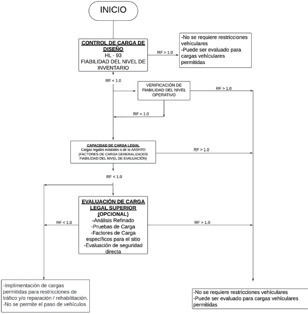 El método LRFR empieza por el análisis de control de cargas de diseño para el camión “HL-93”, el cual se divide en función del coeficiente de capacidad de carga (RF), si se cumple que RF > 1.0 el puente se evalúa para cargas vehiculares permitidas, sin restricciones vehiculares. No obstante, si RF < 1.0 deberá necesariamente pasar por el “Nivel de Verificación de Fiabilidad del Nivel Operativo”, si en este nivel se cumple que RF >1 el análisis del puente se realizará bajo las cargas vehiculares permitidas sin considerar limitaciones en el tráfico vehicular. Sin embargo, si el RF sigue siendo < 1 después del “Nivel de Verificación de Fiabilidad del Nivel Operativo” es necesario continuar con un tercer nivel el cual se denomina “Nivel de capacidad de carga Legal” en donde se utilizarán factores de carga generalizados con fiabilidad del nivel de evaluación, los mismos que permitirán instaurar restricciones de reforzamiento o de peso vehicular.